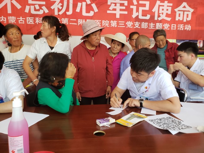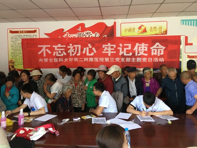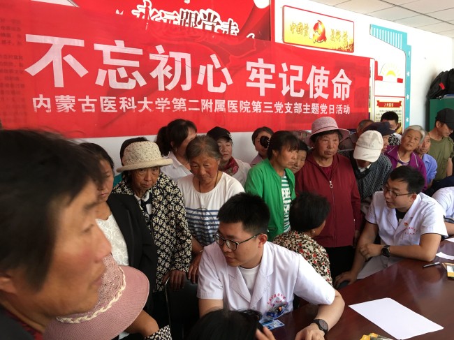 为庆祝中国共产党成立98周年,深入学习贯彻党的十九大精神和习近平新时代中国特色社会主义思想,弘扬党的光荣传统和优良作风,以实际行动展现新时代党员风采。2019年6月30日,我院第三党支部组织脊柱外科、关节外科及药剂科的20余名党员、医护人员来到乌兰察布市卓资县梨花镇土城子行政村开展“健康行·暖人心扶贫义诊”主题党日活动。