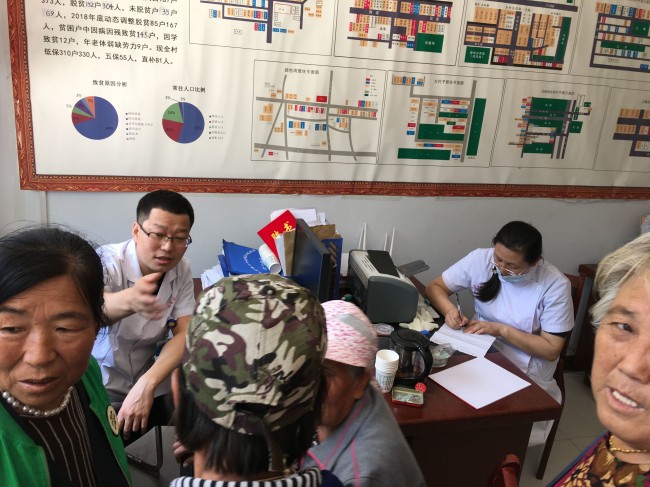 上午9时许,闻讯而来的当地群众早早来到村委会的义诊现场,前来就诊的大部分是贫困户和低保群体。义诊团队一行马上投入到忙碌而有序的诊疗工作中,大家耐心细致、热情周到地为当地群众诊断病情、答疑解惑,免费测量血压、血糖,检查心电图,悉心向大家普及健康教育知识,免费送给患者药品并进行用药指导,发放脊柱、关节疾病防护与保健手册。