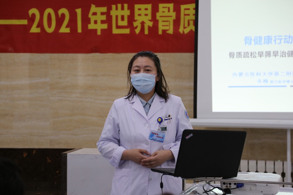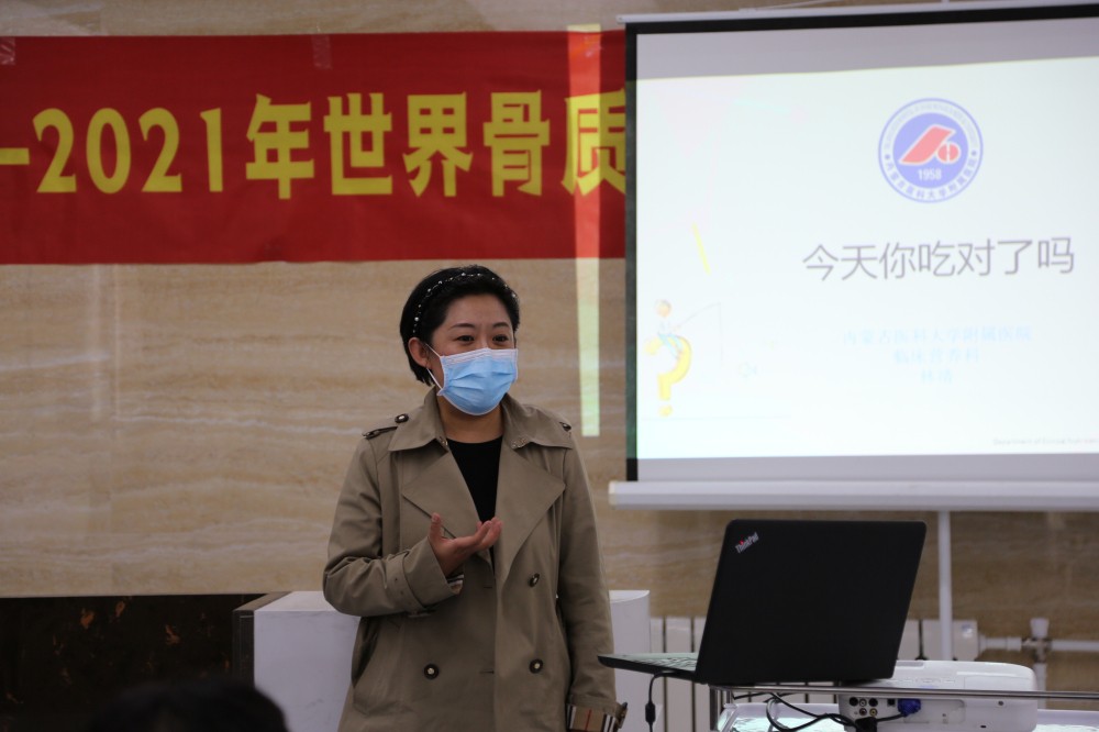 活动还未开始,来了解咨询的患者便络绎不绝。本次活动,特邀内蒙古医科大学附属医院临床营养科林靖副主任医师为大家讲解关于骨质疏松症的营养治疗科普知识。我院骨质疏松科冬梅博士为大家讲解科学预防骨质疏松症科普知识,重点通过加强公众到对骨质疏松症早期预防的认识,警醒高危人群,建立起可行的骨质疏松症预防措施,以此来保护和提高公众的骨骼健康水平。