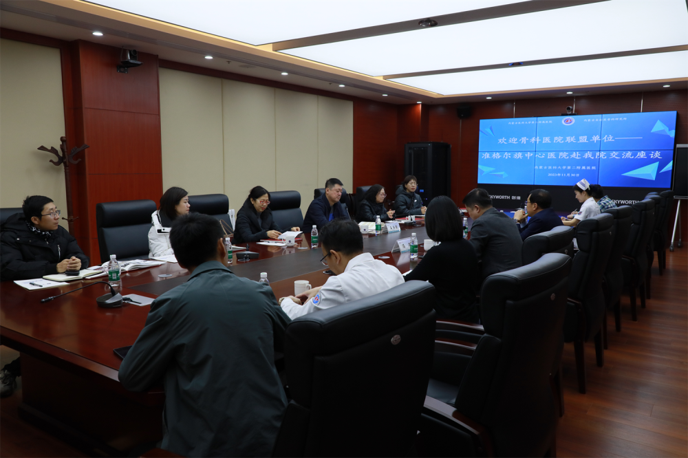 2023年11月30日上午,骨科医院联盟单位——准格尔旗中心医院王玉荣副院长带队一行赴医院开展座谈交流。医院党委副书记、院长邱颐,副院长冯卫以及院办、医务部、护理部、人事部、信息中心、医保(物价)部等部门负责人参加座谈,座谈会由副院长冯卫主持。